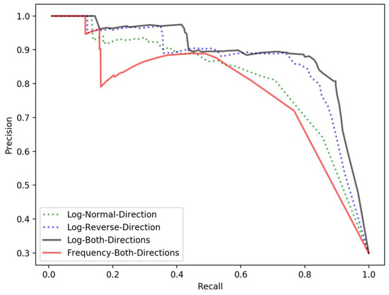 To compare the proposed spatial relatedness models, we plot the precision-recall curves of the spatial relatedness obtained when using the forward direction, the reverse direction, and both directions. We also plot out the precision-recall curve of the spatial relatedness obtained with no logarithm adjustment using the both directions approach. We can evaluate the results of the different approaches and different adjustments by comparing the precision-recall curves. As shown in Figure 13, the spatial relatedness with logarithm adjustment using the both directions approach outperforms the other approaches in both precision and recall. Thus, we adopt this approach to calculate the spatial relatedness variant.