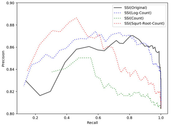 To compare the proposed spatial clustering degree model, we plot the precision-recall curves of the original SSI (without adjusting the entropy sums using the point counts, i.e., p = 1 in Equation (7)) along with three other possible ways of adjusting the entropy sums (i.e., point count, p = 1/|S-tpmk|, log point count, p = 1/log(|S-tpmk|) and square root point count p = 1/(|S-tpmk|)1/2 in Equation (7)). We can evaluate the proposed spatial clustering degree model by comparing its precision-recall curve with the performances of the other models. At first glance, all these curves achieve high precision, between 0.80 and 0.90. As the recall increases, the precision trends in each curve become complicated but are generally similar. When the recall is relatively low (under 0.60), the precision trends in each curve increase; and when the recall is relatively high (above 0.80), the precision trends in each curve decrease. In particular, the proposed spatial clustering degree model (original SSI) performs better than do the other adjusted models regarding both precision and recall when the recall is relatively high (above 0.80). This result suggests that when achieving the same precision, the proposed model correctly extracts more local toponyms than do the other three adjusted models. Thus, we adopted the original SSI approach to calculate the spatial clustering degree variant.