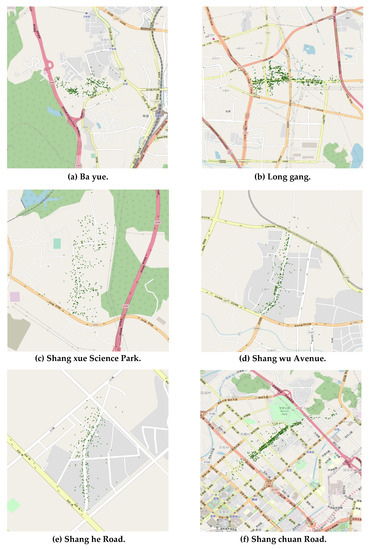Using this procedure, we selected a final threshold of 0.4989 for the spatial relatedness model, which yields a precision of 0.881, a recall of 0.814, and an F-score of 0.846. We selected a final threshold of 15.54627 for the spatial clustering degree model, which yields a precision of 0.856, a recall of 0.989, and an F-score of 0.918. After these thresholds have been determined, neighboring address element candidates can be merged into local toponym candidates. Approximately 605 different local toponym candidates were extracted (a precision of 0.856). Figure 15 shows the geographic distributions of some typical extracted local toponyms.