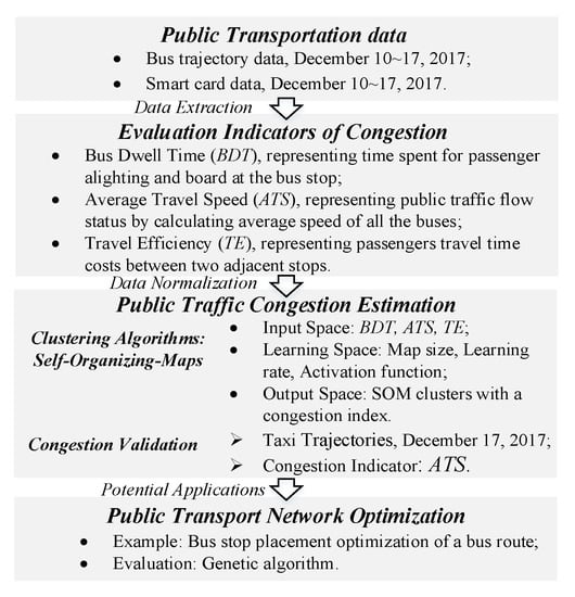 The previous studies have achieved good performance in traffic congestion estimation, which provides practical applications in the fields of urban planning and PTN optimization [19]. In practice, no fixed definitions have been proposed for the level of traffic congestion, while the average travel speed for a road segment is the most commonly used indicator for traffic congestion estimation [15,24]. Unlike the above research, which focuses on the traffic status of one road segment using taxi trajectory data, the aim of our methodology is to estimate the traffic congestion of RSBs using bus trajectory data and smart card data. Our method can be applied to estimate the traffic condition of RSBs with bus priority lanes or with limited taxi trips, which can benefit various applications including bus traffic status estimation, PTN optimization, and urban transport system management.