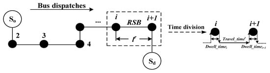 Bus Dwell Time (BDT):Bus dwell time at bus stop i is defined as the time spent for passenger alighting and boarding. The bus dwell time is of great significance to estimate the capacity of a bus station and has also been found to depend on how congested the platform is at the bus stops [35]. The bus dwell time and travel time between adjacent bus stops i and i+1 were estimated by using the method in Reference [36].