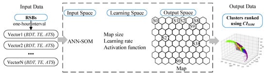 The self-organizing map (SOM) is a type of unsupervised artificial neural network model for the analysis of high-dimensional patterns in data mining applications proposed by Kohonen [37]. Based on their nearness or similarity, the SOM can classify the objects of the system into clusters, for example categories or regions [38]. Compared to traditional clustering algorithms, the SOM has three main advantages: 1) prior knowledge is not required; 2) nonlinearity can be handled; and 3) excellent visualization is provided [39]. The neurons of the SOM are distributed into two layers: the input layer and the output layer by going through a training phase. In this study, the SOM algorithm is employed to classify the RSBs based on the three traffic indicators, and the Python code is used to complete SOM learning. The flowchart of the SOM used in this study is presented in Figure 3.