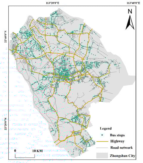 The road network dataset was obtained through the OSM project under the Open Data Commons License [42], which consists of the polylines and attributes information of road links. We also have collected the public transport network dataset (containing the location of bus stops and bus route information) from the authorities (Zhongshan Transportation Bureau, http://jt.zs.gov.cn). Bus stops were used as the ground truth, and a large proportion (98.1%) of these stops matched to a road according to their names and locations, and then the original road network was divided into RSBs based on the bus stops. Figure 4 shows the public transport network in Zhongshan City.