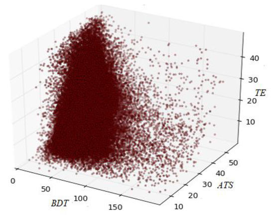 In this section, the congested RSBs were estimated from all the RSBs using the SOM algorithm. First, the three traffic indicators of an RSB (BDT, ATS, and TE) were calculated from the SCD and bus trajectory data at one-hour intervals, and the results are shown in Figure 5.