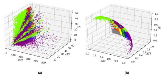 (a) Clustering results of three traffic indicators for RSBs. (b) The normalized results.