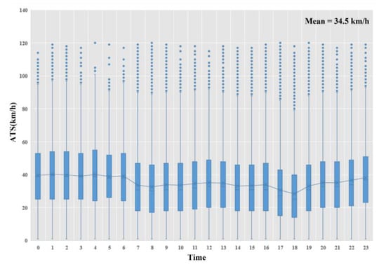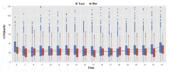 Figure 7 and Figure 8 present the boxplots and mean trends of ATStaxi for all RSBs (Mean_ATStaxi = 34.5 km/h) and congested RSBs (Mean_ATStaxi = 26.0 km/h, Mean_ATSbus = 21.8 km/h) using a one-hour interval, respectively. The average speed patterns of congested RSBs shows obvious valleys during peak commuting hours: 7:00-10:00; 17:00-18:00 (We defined the commuting hours based on [46]), which indicate the most severe traffic congestion times during a day.