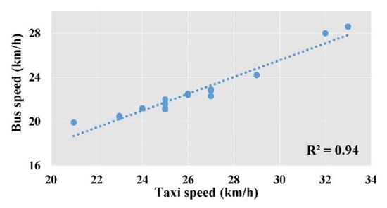 The statistical correlation between taxi speed and bus speed of the congested RSBs.