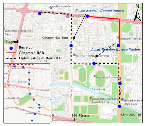 The intelligent bus stops placement of a bus line is one way to alleviate the impact of traffic congestion and thereby improve the ridership of urban public transport system. Taking bus route 031 as an example (Figure 10), the optimization measure for route 031 is to optimize the bus stop placement to avoid the congested RSB.