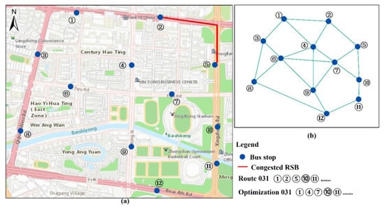 An example of the public transport network. (a) Spatial distribution of the congested RSB. (b) Modified transport network.