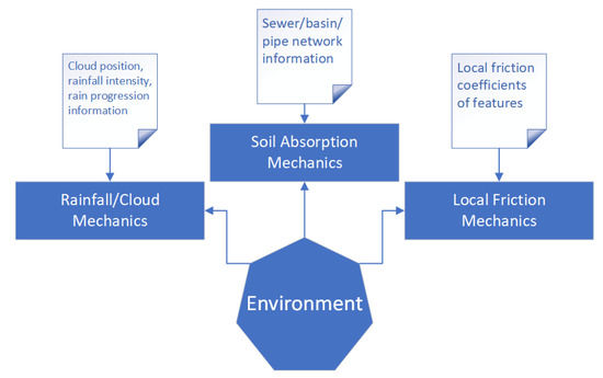 FloodSim, the simulation framework built for this study, contains several modules to accommodate various tasks. These modules are initialized to prepare the simulation engine for environmental parameter utilization, smooth fluid particle behavior, and animated rainfall. Figure 1 shows these FloodSim modules and required inputs for the system to be provided with critical information.