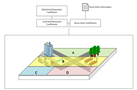 As particle-based simulations focus on particles’ interactions with the surrounding environment, too much interaction may cause slow performance, simulation instability, and consequently, visual anomalies. To prevent this, our work proposes global and local soil absorption coefficients for the study area, and particle removal is handled according to these coefficients. Furthermore, storm drain information, if available, is incorporated into this model, and can be visualized in any resolution that the study area requires. Figure 4 shows an overview of the soil absorption mechanics and how it places absorption coefficients across the virtual environment.