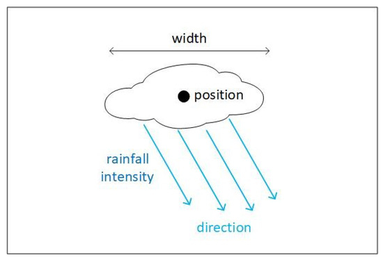 Cloud objects are formed using several parameters to describe the rainfall. These objects are read from a cloud configuration file, which holds references to the clouds with their identifiers, position, rainfall, and rainfall intensity. At this point, it is possible to activate the clouds to make the rainfall occur, but this is normally done dynamically using cloud animation objects to dictate cloud behavior in the simulation. A vector keeps track of the cloud references and the objects get processed at every time step. There is no limit to the maximum number of clouds that can be generated in the study area. Nonetheless, there is a hard particle number limit for real-time simulation purposes, which might stop clouds producing additional rainfall. Figure 5 shows a representation of a cloud object.