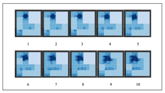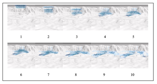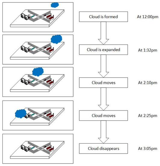 If rainfall data can be acquired, then cloud animation objects can be helpful in designing a real-world scenario and evaluating the results for calibrating the local dynamics of the system. Utilizing the acquired timestamps, the cloud configuration files can carry real-world precipitation information and visualize the event in the system through appropriate calibration of the local environment. Figure 6 shows a representation of how cloud animation data files work and how they help the simulation engine to visualize cloud information over time.