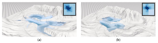 FloodSim uses parameters to define the friction between water particles and the environment. Figure 8a shows an example terrain without the use of the local friction coefficients, thus utilizing only the default parameters, which only account for default surface friction and particle friction coefficients. Figure 8b shows the same environment with the inclusion of local friction coefficients to represent high vegetation. To simplify the demonstration, the environment is defined as an “area with high vegetation” for its entirety. Through realization of the environmental parameters, velocity is decreased according to the Manning formula. Consequently, this extra friction stops the water from spreading out as quickly and thus contains the water.