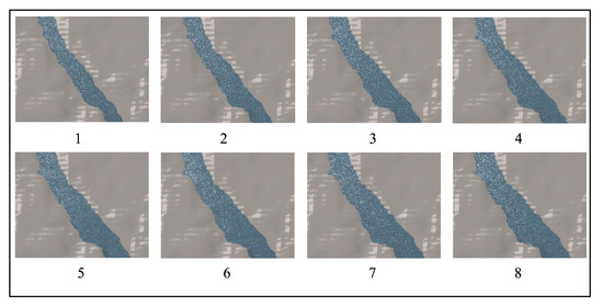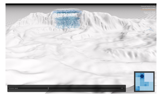 Frames from an animation of the river flooding are provided in Figure 15. Flooding was captured around every 100,000 particles of increase in water amount and lasted a total of 220 s. Once the simulation reached approximately 1 million particles, the amount of water required to demonstrate the flooding was placed into the riverbed. Additional time was reserved for waiting for the simulation to reach a stable state. Upon visual investigation of Figure 14 and the result generated by FloodSim, it can be seen that the flooding area was visualized similarly. Nevertheless, some parts of the flooding were not visualized accurately. This is partly due to flood defenses, which our method does not account for, and due to the resolution of SRTM, which FloodSim works with. Improving the DEM model and providing a more detailed river bathymetry would improve results. Nevertheless, performance is still a concern if the current configuration of CPU and GPU are to be utilized.