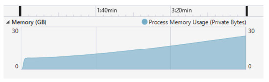 To run these simulations, an Alienware Aurora R6 with Intel i7-7700K processor, NVIDIA GeForce 1080 display adapter, and 32 GB of physical RAM was utilized. First, the framework was tested for memory usage, disabling soil absorption and particle removal. Figure 13 shows that with constant particle generation for 5 min, 3.5 million particles were generated and 23.8 GB of RAM was used up. As memory would be required to continue the processes within the solver and compute interaction between particles, it would not be feasible to work with such a setup. Therefore, scalability is an important concern for the simulation of larger areas. Fewer particles means less detail in the description of flooding, and therefore errors should be expected. Such errors must be accounted for through the provision of precise details about the study area and utilization of more capable CPUs and GPUs.