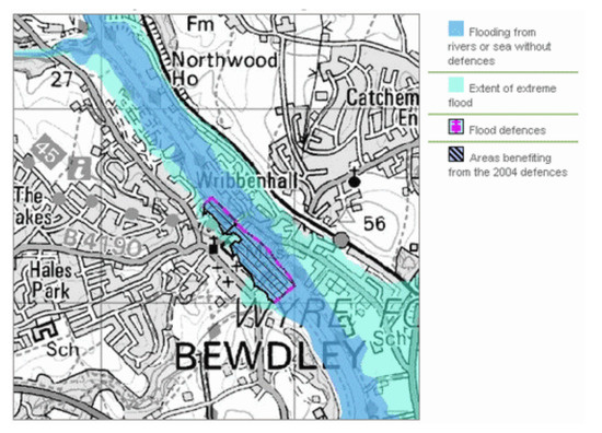 Map of Bewdley, extent of extreme flooding scenarios and flood defenses [49].