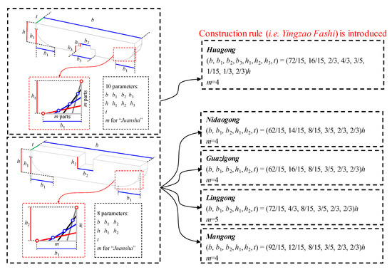 In comparison with Huagong, a flat notch in the middle of the top is adopted for the other four types of gongs. A unified parametric model is developed, as shown in Figure 3b. This model is designed with eight parameters as follows: total height h, height of “juansha” h1, height of notch h2, total length b, length of “juansha” b1, length of notch b2, width t, and number of parts of “juansha” m. The proportional relationships of each parameter are also introduced for these four types of gongs as the characteristics. Due to length limitations, the original description of the proportional relationships specified in Yingzao fashi is not converted here, but the proportional relationships are directly presented in Table 1.