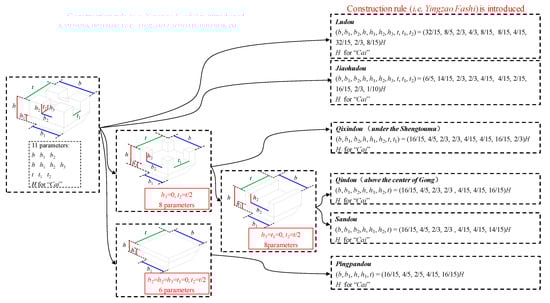 Based on the above discussion, a parametric model system with an emphasis on commonality and characteristics is proposed, as shown in Figure 4 for the gongs. The common parametric models stated above are illustrated on the left side, which generalize components with an identical appearance and express them from a mathematical point of view. If all the parameters can be obtained through surveying and mapping technologies, the model can then be established directly. However, the parameters cannot be usually obtained owing to stacking. The historical knowledge of Chinese AWA structures is usually introduced to deduce the invisible parameters, and the proportional relationships are integrated, as shown on the right side of Figure 4. The fundamental idea of the reasoning method is that the component type is identified first through the proportional relationships between the visible dimensions; the invisible dimensions of the component are deduced based on visible dimensions and proportional relationships between the visible and invisible dimensions.