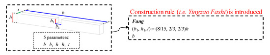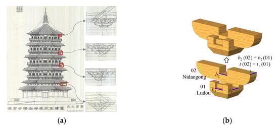 The dou-gong is the most important and sophisticated element in Chinese AWA structures. The dou-gong is composed of four typical components (i.e., dou, gong, ang, and fang) and is assembled by following specific principles (as shown in Figure 1a). Similar to modern architecture, the Chinese AWA also adopts the fundamental concepts of standardization and modularization. In the AWA structures constructed during the Liao and Song dynasties, the typical components were highly standardized. The “caifen zhi” in “Yingzao fashi” specified the shape and modulus of each component [31]. Specifically, the absolute value of a specific characteristic size, as well as the proportional relationships between other characteristic sizes and this specific characteristic size, were prescribed. Therefore, parametric models for such components can be developed.