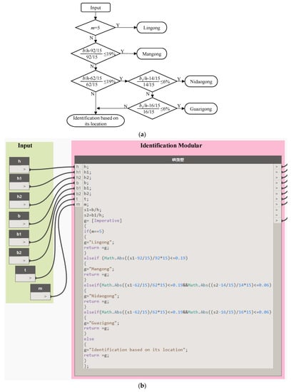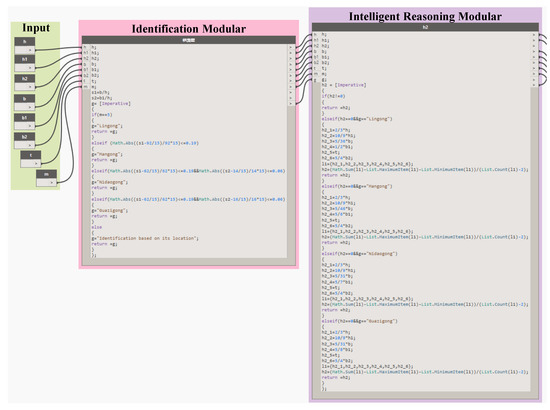 The identification method described above is programmed in Dynamo. The corresponding logic diagram and implementation diagram in Dynamo are presented in Figure 7. Detailed procedures are given as follows. (1) All the available parameters should be input first. (2) b/h and b1/h are calculated, and the type of gong is defined as a variable named g. (3) If m is equal to 5, Linggong is assigned to g; otherwise, the absolute relative error between b/h and 92/15 is calculated. If the absolute relative error is not higher than 19%, the type of gong is identified as a Mangong. Otherwise, the absolute relative error between b/h and 62/15 is calculated and is mostly not greater than 19%. Then, the absolute relative error between b1/h and 14/15 is further calculated, and if this error is not higher than 6%, the component is identified as Nidaogong. Otherwise, the absolute relative error between b1/h and 16/15 is calculated, and if it does not exceed 6%, the gong is then identified as Guazigong. (4) If the gong does not belong to any of the situations mentioned above, “identification based on its location” is assigned to g. (5) Finally, the result is transferred to the “parameters reasoning program.”.