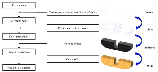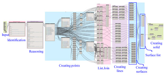All the parameters, including the exposed and deduced parameters, were obtained to establish the model. An automated modeling method was subsequently required. The traditional modeling method in Revit, i.e., points-to-lines, lines-to-surfaces, and surfaces-to-solid, as shown in Figure 9, was also programmed based on Dynamo.