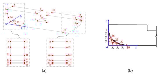 For the gong, two types of characteristic points were considered and defined, which were the points on juansha (e.g., 22, 23, and 26 in Figure 10b) and the other points (e.g., 1, 2, and 3 in Figure 10a). For the other points, with all the parameters for the common model, the coordinates of such points can be obtained by simple addition and subtraction. Subsequently, Point.ByCoordinates in Dynamo was directly used to create the points. For the points on juansha, taking m equal to 4 as an example, the process of creating such points involved the following four steps: (1) h1 (the distance between Point 1 and Point O in Figure 10b) and b1 (the distance between Point 19 and Point O in Figure 10b) were equally divided into four parts. Point.ByCoordinates in Dynamo was also used to create the points obtained through such equalization (i.e., S1, S2, S3, S4, S5, and S6 in Figure 10b). (2) Line.ByStartPointEndPoint was called to connect Points 1 and S4, Points S3 and S5, Points S2 and S6, and Points S1 and 19, and four lines were generated. (3) The four generated lines were named L1, L2, L3, and L4, respectively, and the intersections of L1 and L2, L2 and L3, and L3 and L4 were points on juansha that were required for the modeling. Geometry.intersect was subsequently used to determine the intersections (i.e., Points 22, 23, and 26) of 4 lines. Meanwhile, the corresponding coordinates were also obtained through Point.X, Point.Y, and Point.Z. (4) Most components were symmetrical, through which the characteristic points of the other three parts of juansha can be determined using the function, Translate, in Dynamo. For example, according to the symmetry in the direction of length b, Point 26-1 can be determined from Point 26. Based on the symmetry in the direction of thickness t, Point 25 can be determined from Point 26, and Point 25-1 can be determined from Point 26-1.