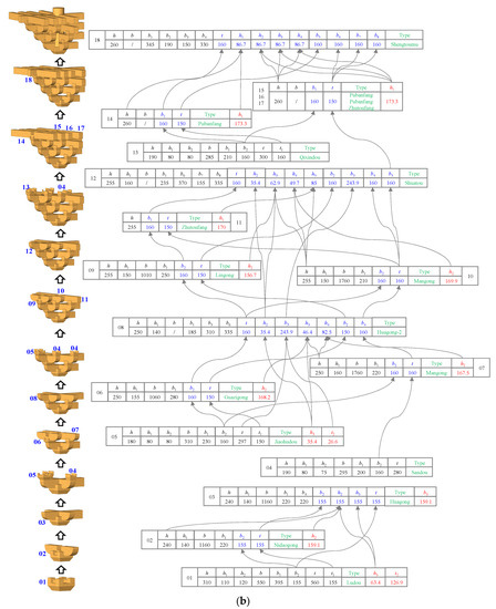 In actual engineering practice, the dou-gong is usually stacked. The exposed and measurable dimensions (i.e., the input parameters presented in Section 3.1) in the common model can be obtained, whereas the invisible dimensions are the parameters that should be reasoned in this model. During this procedure, the historical knowledge (i.e., the proportional relationships between each parameter) is required and integrated in Dynamo as the characteristics.
