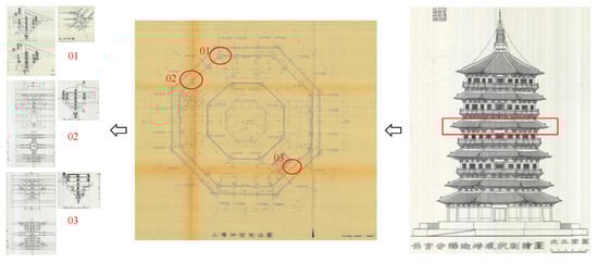 The HBIM model of the renowned Yingxian Wood Pagoda was established based on 2D drawings to further validate the feasibility of the proposed method in actual engineering practice. As mentioned earlier, Guixiang Wang obtained the most comprehensive data of Yingxian Wood Pagoda in 1991. A full set of 2D drawings for each component, such as dou-gong, columns, and beams were used to present the dimensions of the visible components and the connection relationships of each component. The drawings of three types of dou-gong and their floors are presented in Figure 14.