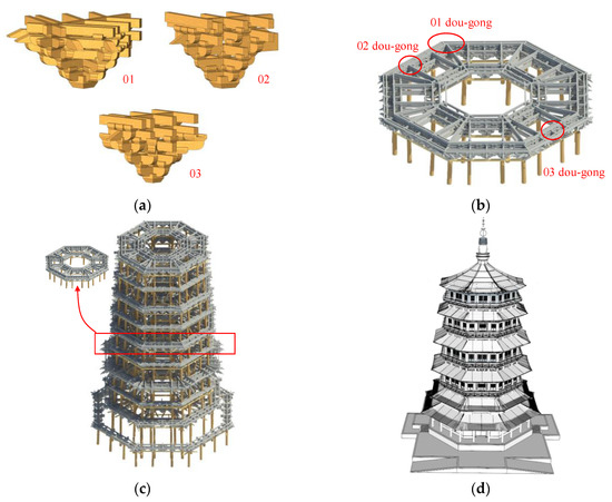 The fundamental concept, i.e., from the component to the floor and from the floor to the entire structure, was implemented in the entire modeling process. In particular, the entire modeling process was divided into the following four steps as follows. (1) All the dou-gongs in the pagoda were established using the proposed method as elaborated in Section 4.1. The typical dou-gongs, which are consistent with those displayed in Figure 14, are presented in Figure 15a. (2) All the dou-gongs on each floor were assembled according to the 2D drawing of the floor. The beams and columns with simple appearances were manually established and assembled with the floor, leading to a single floor, as shown in Figure 15b. (3) All the floors were assembled, and the structure of the Yingxian Wood Pagoda was established, as presented in Figure 15c. (4) Finally, elements such as the decorative eaves, windows, doors, and foundations were manually added to the structure, and the entire architecture was established, as shown in Figure 15d.
