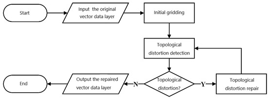 In this paper, based on the 9-intersection model [18], the topological distortions that may occur in the gridding of vector features in DGGs are classified, and the corresponding topology-preserving gridding methods for vector features are designed for different types of distortions. The 9-intersection model formally captures topological relations between two spatial objects through the geometric intersections of the objects’ interiors, exteriors, and boundaries. For all kinds of vector features, this method can be divided into three main steps: initial gridding, topological distortion detection, and topological distortion repair, as shown in Figure 2.