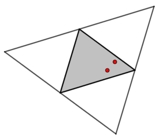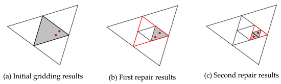 Because of the multi-resolution characteristic of DGGs, when topology distortion is repaired, the position information of the point features with topology distortion can be described by using the grid cells of a higher level until all the topological distortion is eliminated, as shown in Figure 8.