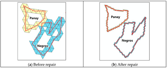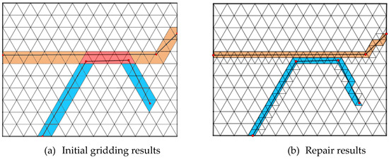 The misclassification of key grid cells leads to the above topological distortion, and the fundamental reason why key grid cells are incorrectly divided is that the expression accuracy of the narrow region of the polygon feature is not of high enough resolution. Thus, the above topological distortion can be repaired by using a higher-level grid cell to express the polygon. First, the key grid cells of the polygon feature with topological distortion are replaced with high-level grid cells. After that, the ownership of all new grid cells is determined according to the principle of area dominance, and the key grid cells are re-determined. Finally, the topological distortion detection is performed again until all topological distortions are repaired, as shown in Figure 12.