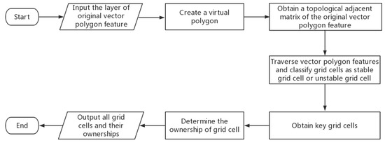 In this paper, the most widely used principle of area dominance [24] is adopted in the initial gridding of polygon features [17,25]. In the process of initial gridding, it is necessary to record the topological adjacency relationship between the original polygon features and the stable grid cells, unstable grid cells, and key grid cells of each polygon object, so as to facilitate the subsequent topological distortion detection and repair. The specific processes are as follows (Figure 11):
