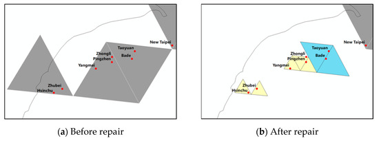 In Figure 8a, the two original point features are disjoint, but after the initial gridding, they are transformed into the same grid cell, and their topological relationship changes from disjoint to equals, accordingly. When the distortion is repaired, the two original point features are the first gridding with a higher-level grid cell, but the two features are still located in the same grid cell (Figure 8b); thus, the process is repeated and a higher-level sub-grid cell is used so that the original two point features are transformed into different grid cells (Figure 8c). The topological relationship is restored to disjoint and the repair is completed.