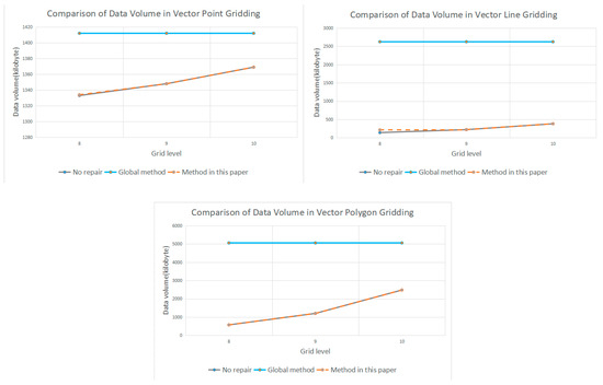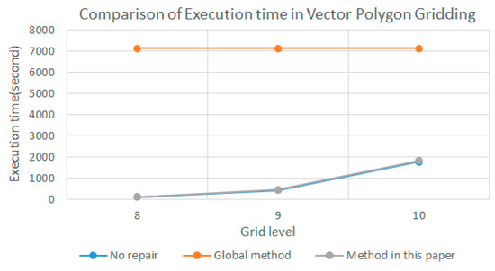 From the experimental results for data volume, it can be seen that compared with the method of increasing global grid resolution, the data volume added by the method in this paper is negligible. The topology-preserving gridding method for vector features determines objects whose topological relationships change by topological distortion detection. According to the multi-level resolution characteristics, only the resolution of these objects is increased recursively. Therefore, compared with the global grid resolution method, the data volume is greatly reduced while maintaining the topological relationship of the original vector features.