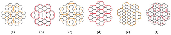 Centroid alignment and vertex alignment of three apertures for hexagonal grids (shown in orange and red, respectively): (a) and (b) are for aperture 3; (c) and (d) are for aperture 4; (e) and (f) are for aperture 7 (source—cited from [24]).