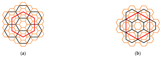 Diagram of mixed aperture 3 and 4: (a) aperture sequence 34; (b) aperture sequence 43. The red cells are the initial cells at level 0; the black cells belong to level 1; the orange cells belong to level 2 (source—own study).
