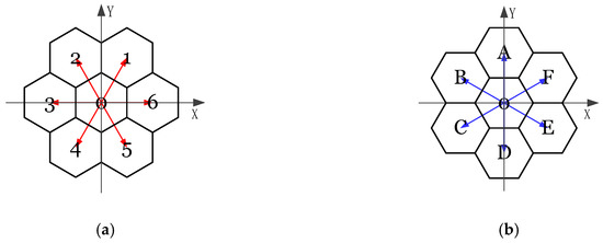 Two types of cell directions for the mixed aperture 3 and 4 hexagonal grids on the plane and the digits are marked for each basic vector of cell direction: (a) the first type of cell direction; (b) the second type of cell direction (source—own study).