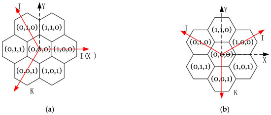 The IJK coordinate system defined for mixed aperture 3 and 4 hexagonal grids: (a) is used in the first type of cell directions and (b) is used in the second type (source—own study).