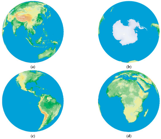 Resampling results of the GTOPO30 DEM dataset based on the proposed scheme: The four figures are different views of the globe: (a) Europe and Asia; (b) Antarctica; (c) North America and South America; (d) Africa (source—own study).