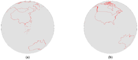 The above algorithm using our proposed index addition is compared with the algorithm using spherical geometry operations to realize the discretization of the vector lines on the sphere. The two algorithms are both implemented in C++ and compiled into the release version and executed on a compatible PC (Hardware configuration: Intel Core i5-6500 CPU@3.20 GHz, 8 GB RAM and Kingston 120GB SSD; Operating System: Windows 7 X64 Ultimate SP1; Development Tools: Visual Studio 2012 Update 5). The vector data for this experiment are the boundaries of six countries—namely, China, America, Canada, Russia, Brazil, and Australia—and are obtained from the 1:250,000 basic geographic information database of the Chinese State Bureau of Surveying and Mapping. Each boundary is considered a closed polygon. The discretization result of our algorithm is shown in Figure 16. We also calculate statistics on the generation efficiency of discrete lines for the two algorithms from grid levels 16 to 20. The number of grid cells rasterized unit time, which is 1 ms in this paper, is used as the measurement of efficiency, thus the higher the values, the better the performance. The generation efficiency of the two algorithm is shown in Table 4 and Table 5. In the two tables, the left column represents the countries the tested vector boundary data belong to the following five columns are the related efficiency of different country boundaries from level 16 to level 20, and the last column is the average generation efficiency of the five levels.
