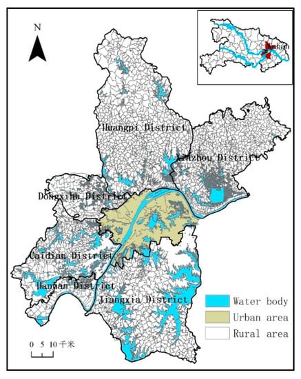 Wuhan is located in the center of the hinterland of China, specifically in the east of Jianghan Plain and at the intersection of the Yangtze River and Hanjiang rivers. Wuhan is the central city of central China and the capital of Hubei Province. The city enjoys superior natural conditions and a long history of agricultural development. The research area consists of 2206 administrative villages in six new urban districts with a total area of 7614 km2 under the jurisdiction of Wuhan City; the six new urban districts are Dongxihu District, Hannan District, Caidian District, Jiangxia District, Huangpi District and Xinzhou District. As of 2017, the permanent population of the new urban districts was 3.7528 million, of which 2.563 million is the agricultural population, which accounts for 68.3% of the total population. The rural hinterland is vast, and the characteristics of the metropolitan area are obvious. The disposable income of rural residents is 18250 yuan, and the output value of the primary industry is 38.269 billion yuan. Wuhan is in the advanced stage of urbanization (the urbanization rate in 2017 was 80%), and the central urban areas have essentially achieved a 100% urbanization rate. With the strengthening of the interaction between urban and rural elements in Wuhan, urbanization is an important factor in rural development in the new urban districts. Therefore, the six new urban districts were selected as a typical case study (Figure 1).