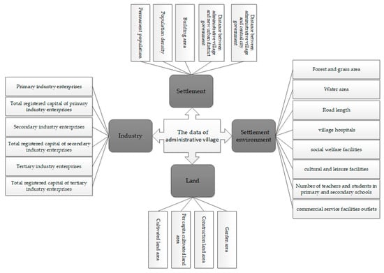 The data of the administrative village came from the Wuhan Geomatics Institute. The data mainly included settlement, land, industry and human settlements environment (Figure 2). The total number of the administrative villages identified in Wuhan City’s new urban districts was 2206 in 2017, and are stored in the formats of texts and tables. Through a scientific analysis, the data together with the vector data of the Wuhan map were stored in the format of ArcGIS vector data, as were the data on Wuhan’s social and economic development.