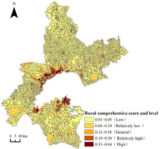 Urban is the spatial territory system with non-agricultural industries and non-agricultural population agglomeration as the main characteristics, while rural is all the spatial territory system except urban. There is no absolute spatial break point in urban–rural territory systems. Therefore, the difference of urban–rural territory systems does not lie in space, but mainly in function. The urban territory system mainly provides non-agricultural products, non-agricultural services and non-agricultural employment opportunities. Comparatively speaking, rural territory system mainly carries out agricultural production to furnish agricultural products and services, and gives play to its social and ecological functions []. As urban–rural links become closer, significant changes have taken place in the regional structure, industrial structure, employment structure and social structure between urban and rural areas. Urban–rural integrated development is proposed to achieve urban–rural equivalent development []. We need to know the rate of development in rural areas, which can allow for understanding the extent of increase in urbanization. Moreover, there are few studies on the evaluation of rural development level in Wuhan. Therefore, we need a system of indicators to evaluate the level of rural development in urban areas.