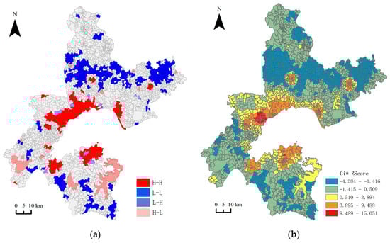 Local Indicators of Spatial Association (LISA) (a) and cold hot spots (b) of rural development level in administrative villages of Wuhan City’s new urban districts.