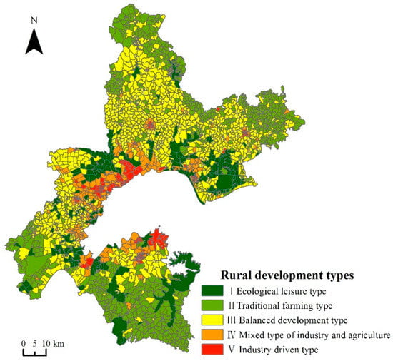 Based on the scores of the seven principal factors of each administrative village, rural development types with five dominant characteristics were determined (Figure 6).