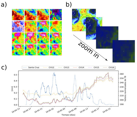 In this figure, some stages of a learning activity used during the FGP process are shown. (a) All 16 channels of GOES-East were animated in high resolution for a period of five days (prior to, during and after Tropical Storm Nate’s effects). (b) Different zoom levels were used to bring the student from the big picture to the regional effects observed by the satellite. (c) One of the figures used by the student to contrast surface measurements of precipitation (blue line) and channel variation in time (other five lines) is included as an example of the educational resources. The titles are in Spanish as the products were developed in that language.