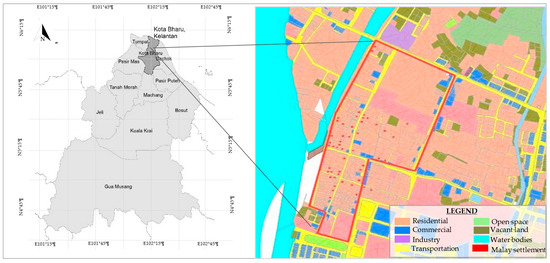 Kota Bharu is located in the state of Kelantan in East Malaysia (6°8′23.5392″ N, 102°14′31.9308″ E), approximately 500 km from the capital city of Kuala Lumpur. The city is important, given its traditional society and influence on Malay heritage, and the growth here is slow compared with other states in the country. This site is important because it is one of two states that have been able to preserve traditional Malay settlements with their unique architectural forms for over 100 years. These traditional Malay towns have clear civic boundaries, with the king’s palace designated as the central administrative area (Figure 1).