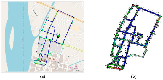 MLSs consisting of inertial measurement units (IMU) and global navigation satellite system (GNSS) laser scanners, a distance-measuring indicator, and calibrated optical cameras were used for the georeferenced and adjustment data. The unit was produced with time-screened, dense clouds up to 700,000 point per second. The MLS also captured 360˚ horizontal and 30˚ vertical views, increasing the visibility of the collected data and reducing laser shadows. Figure 3a,b depicts the trajectory taken by the system installed on a car to study the 30-ha area. Trajectory and segments were colored by time. The different color of the reflected surface and nearby trajectory caused by the time difference. A distance of 15 km was covered in half a day, with the respective point clouds measured at a point spacing of approximately 4 cm.